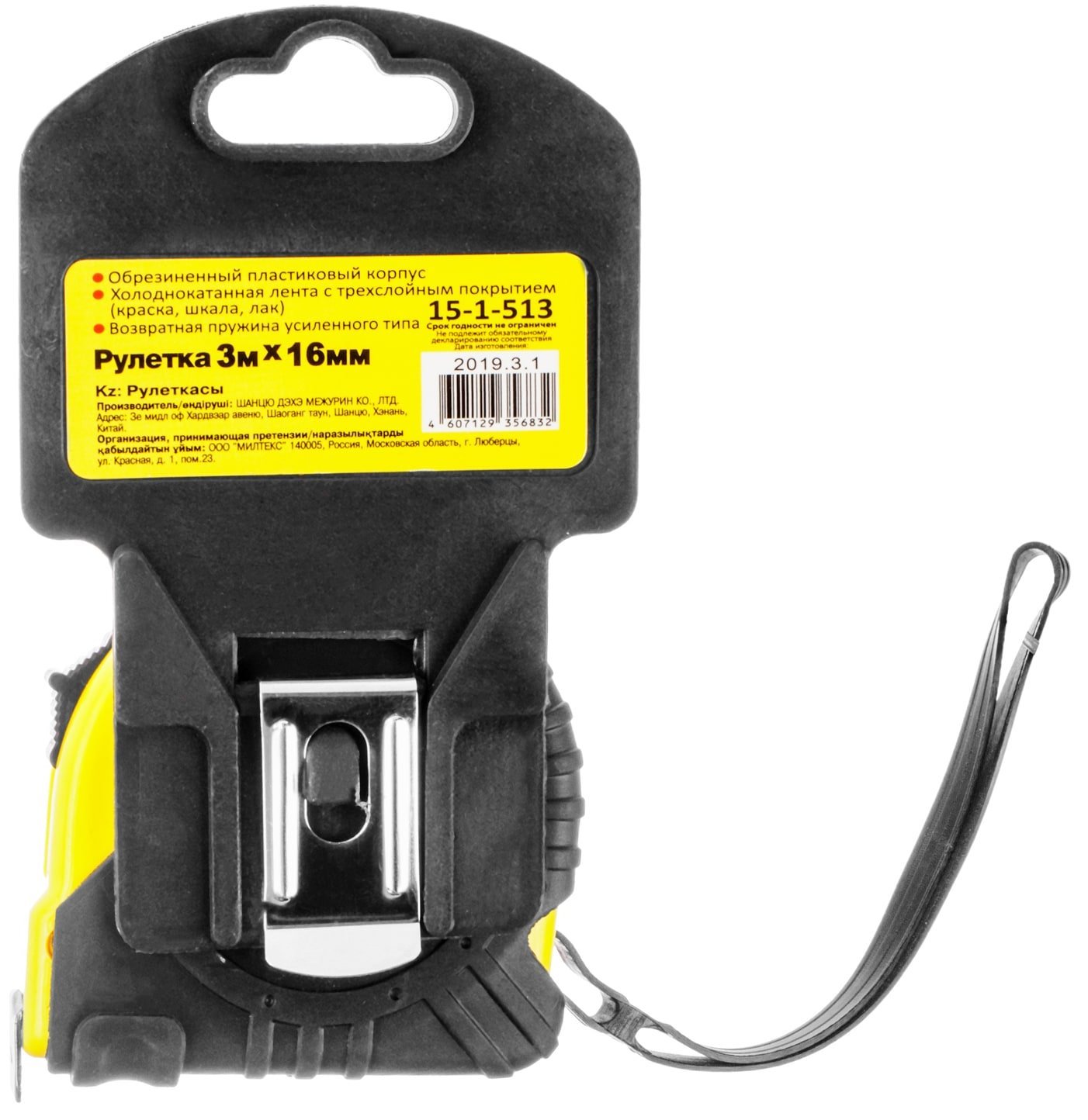 Обрезиненный пластиковый корпус обеспечивает надёжный хват даже во влажных или перчаточных руках, а также защищает механизм от ударов при падении. Стойкая к излому ухолоднокатаная лента с трехслойным покрытием (краска, шкала, лак) устойчива к изгибу, легко выдвигается и сохраняет форму при горизонтальных и вертикальных измерениях. Металлический концевой крючок компенсирует погрешность при измерении «в упор» и «в натяг», обеспечивая максимальную точность. Возвратная пружина усиленного типа работает тихо, надёжно и без рывков даже после многократного использования.
