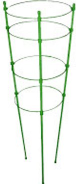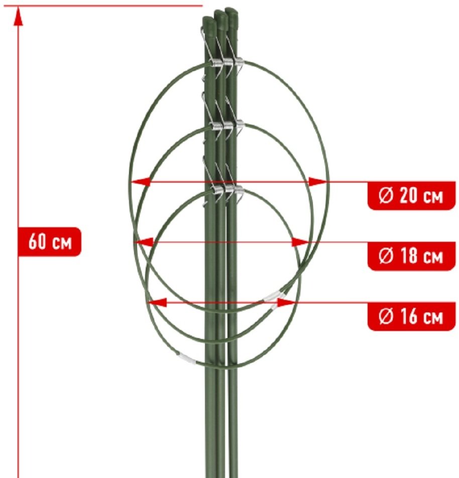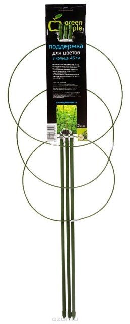 Поддержка для цветов состоит из 3-х колец и используется в качестве опоры для садовых и комнатных растений. Благодаря пластиковому покрытию она не подвержена воздействию окружающей среды. За счет зеленого цвета поддержка не отвлекает на себя внимание, легко маскируется среди ветвей. Кольцевая опора для растений высотой 60 см используется в качестве поддержки раскидистых культур. Отличается прочностью, устойчивостью к агрессивному воздействию окружающей среды. Не гниет, не имеет ограничений по сроку годности. Хорошо выдерживает вес растений, не деформирует листовые пластины и стебли.
