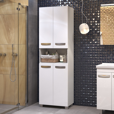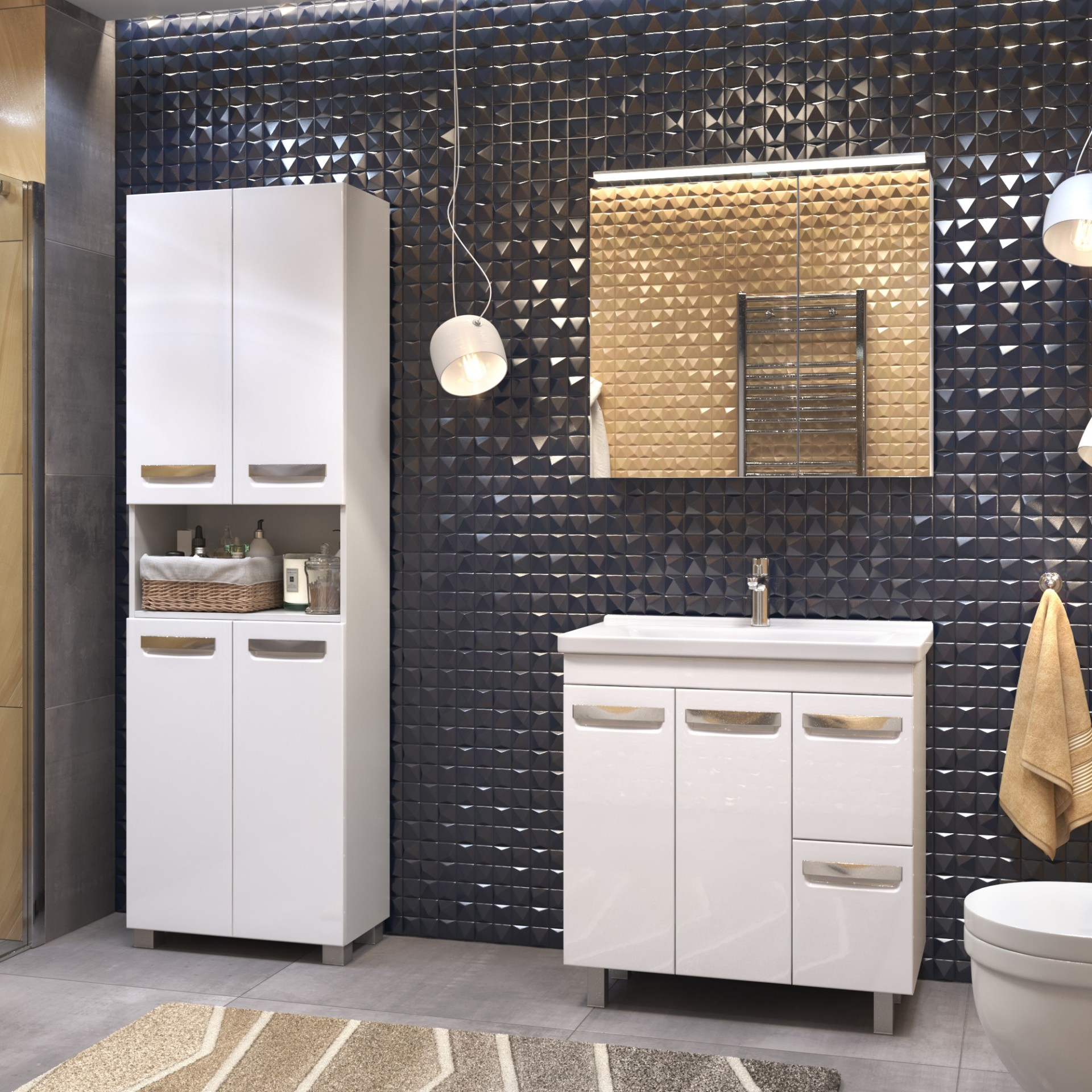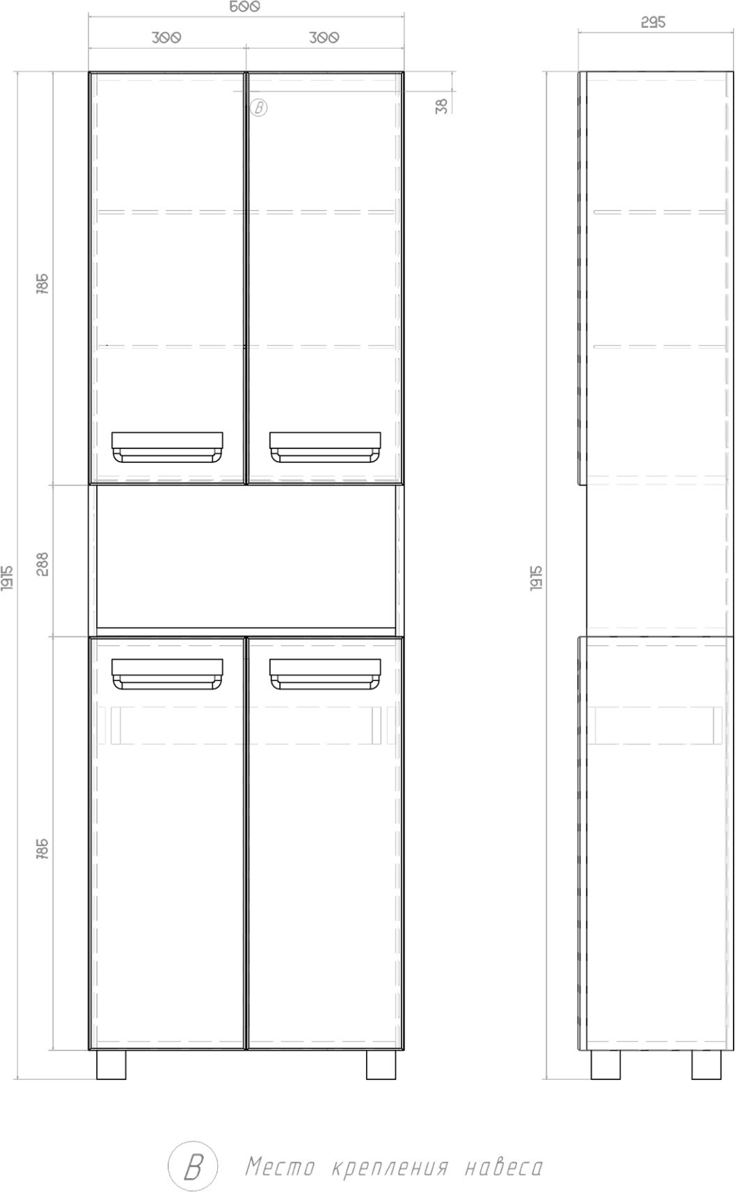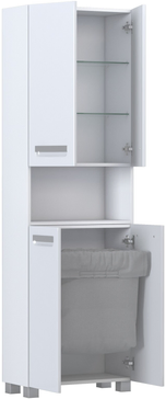 Оснащение: 2 дверцы, 1 ящик с бельевой корзиной, 2 полки ЛДСП, ручка врезная металлическая хромированная.