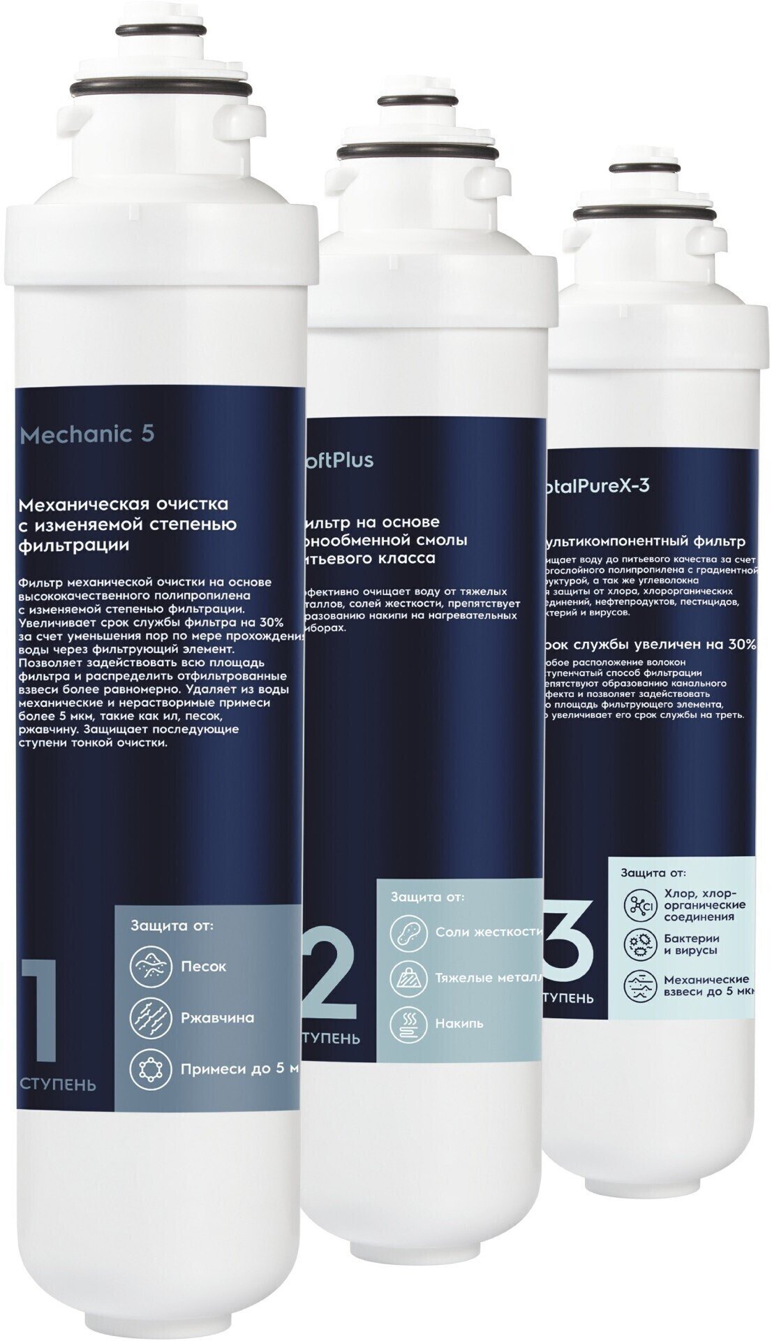 Ступень очистки на основе ионообменной смолы питьевого качества удаляет соли жесткости и предотвращает образование накипи на нагревательных приборах.