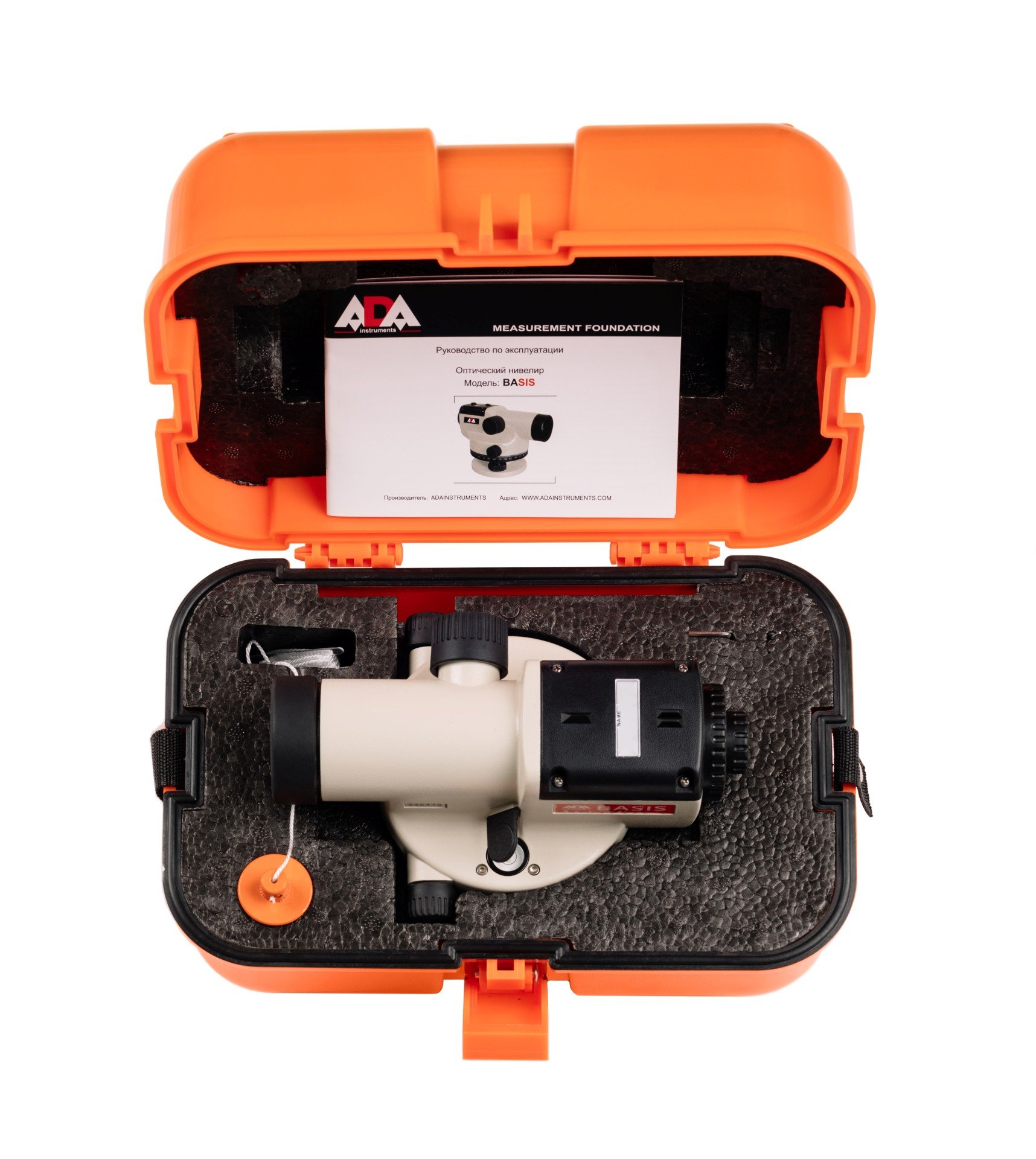 Преимущества модели ADA Basis: - Встроенный компенсатор с магнитным демпфированием обеспечивает автоматическую горизонтальную наводку; - Прочный алюминиевый корпус устойчив к механическим нагрузкам и перепадам температур; - Удобная фокусирующая ручка и мягкие вращения наводящих винтов позволяют быстро и точно навестись на рейку; - Совместимость со всеми стандартными штативами и нивелирными рейками.