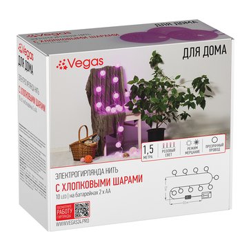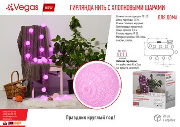 - Электрогирлянда Нить VEGAS с Хлопковыми шарами 1,5м розовый