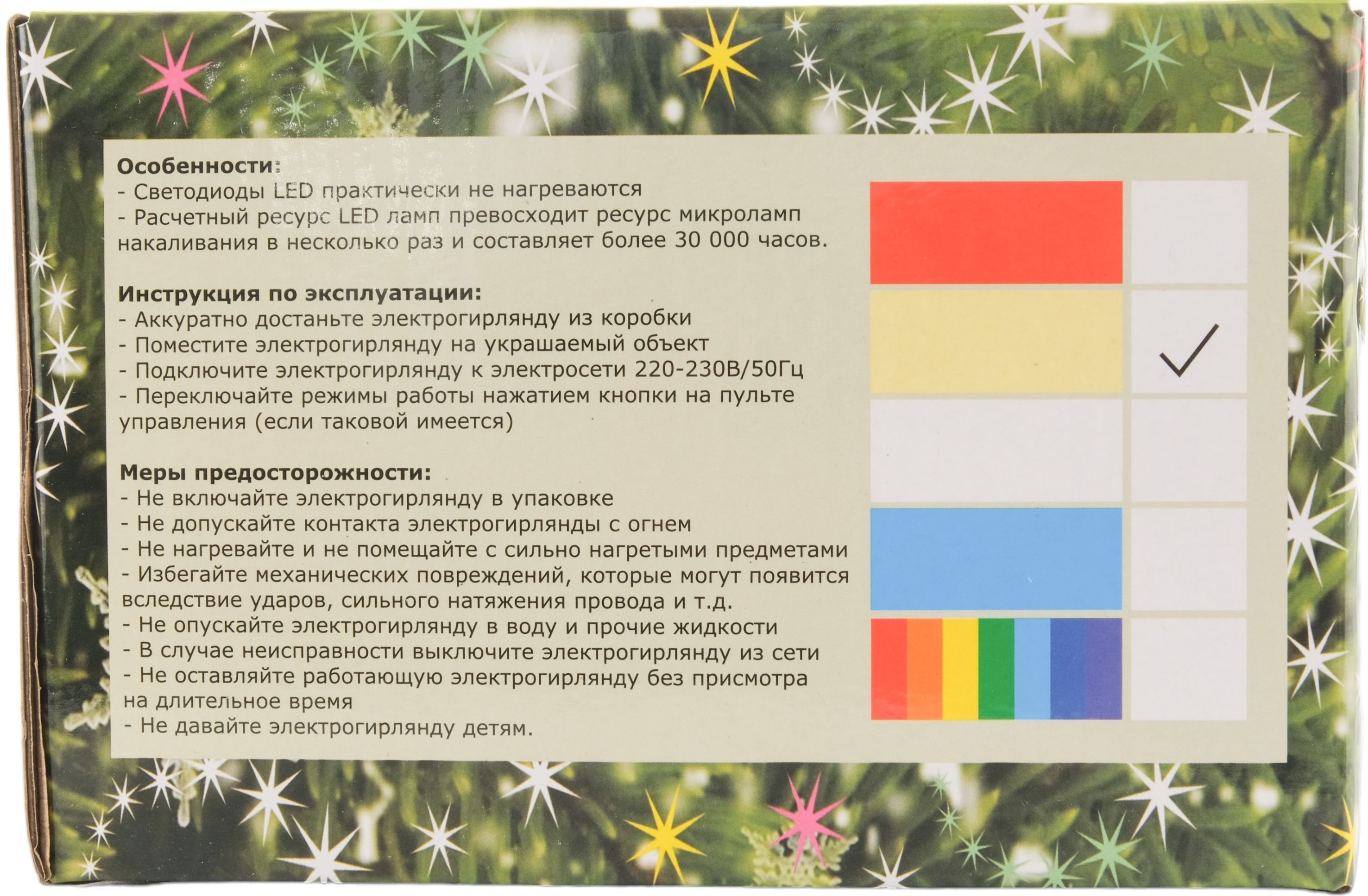 Данная гирлянда рассчитана на длительное использование,не бьется, устойчиво к внешнему воздействию, удобна и легка в обращении и подключается непосредственно к электросети 220 V без каких-либо дополнительных устройств.