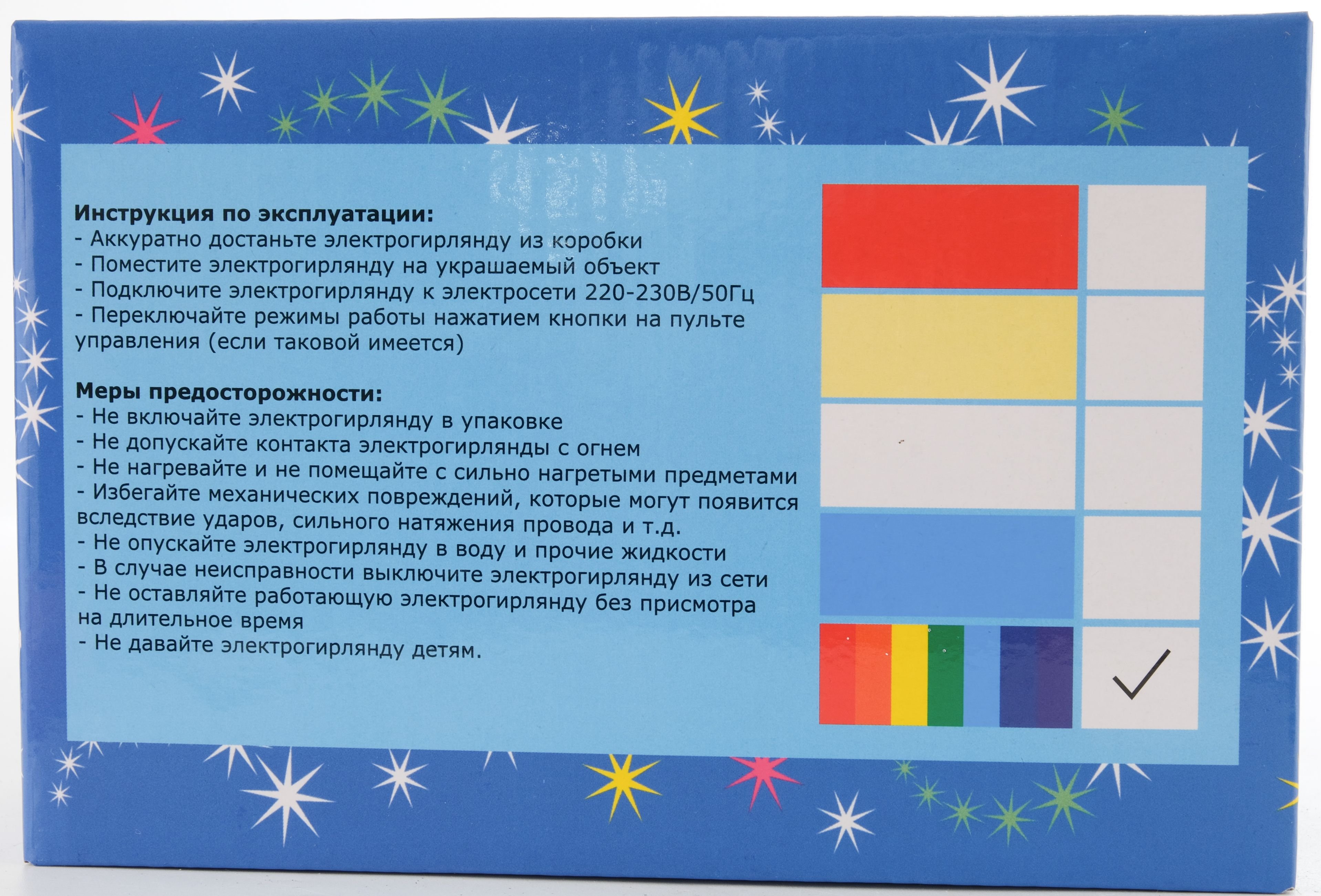 Данная гирлянда рассчитана на длительное использование, устойчиво к внешнему воздействию, удобна и легка в обращении и подключается непосредственно к электросети 220 V без каких-либо дополнительных устройств.
