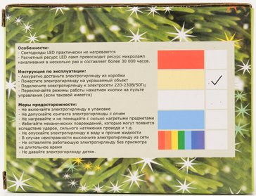 Данная гирлянда рассчитана на длительное использование,не бьется, устойчиво к внешнему воздействию, удобна и легка в обращении и подключается непосредственно к электросети 220 V без каких-либо дополнительных устройств.