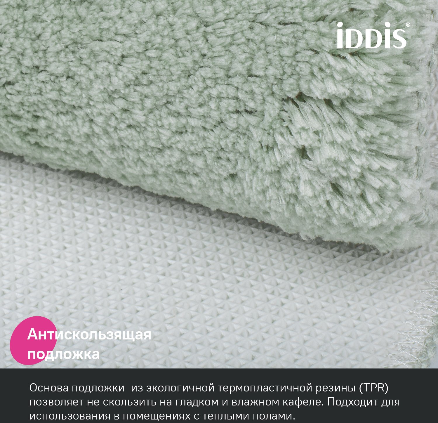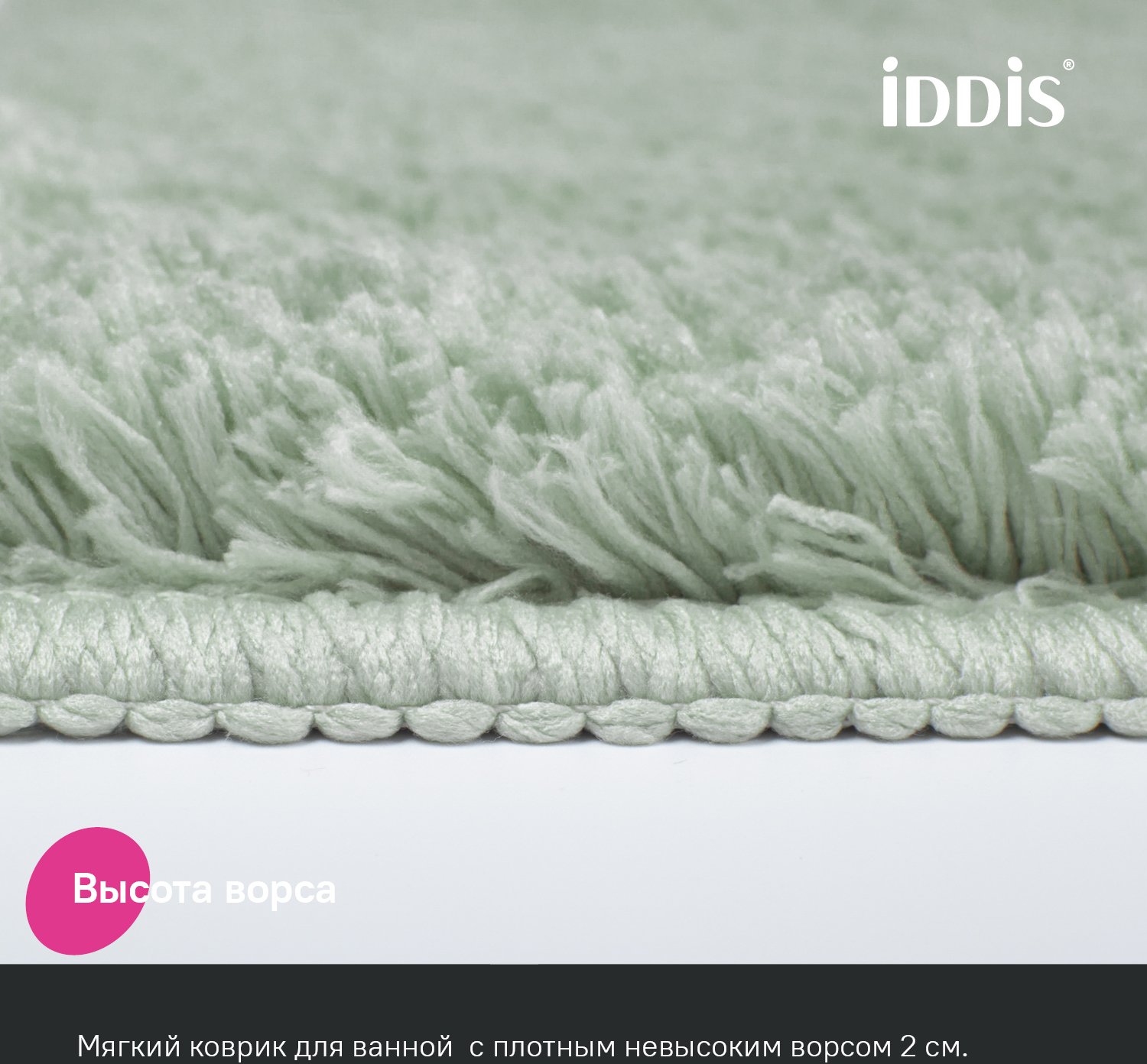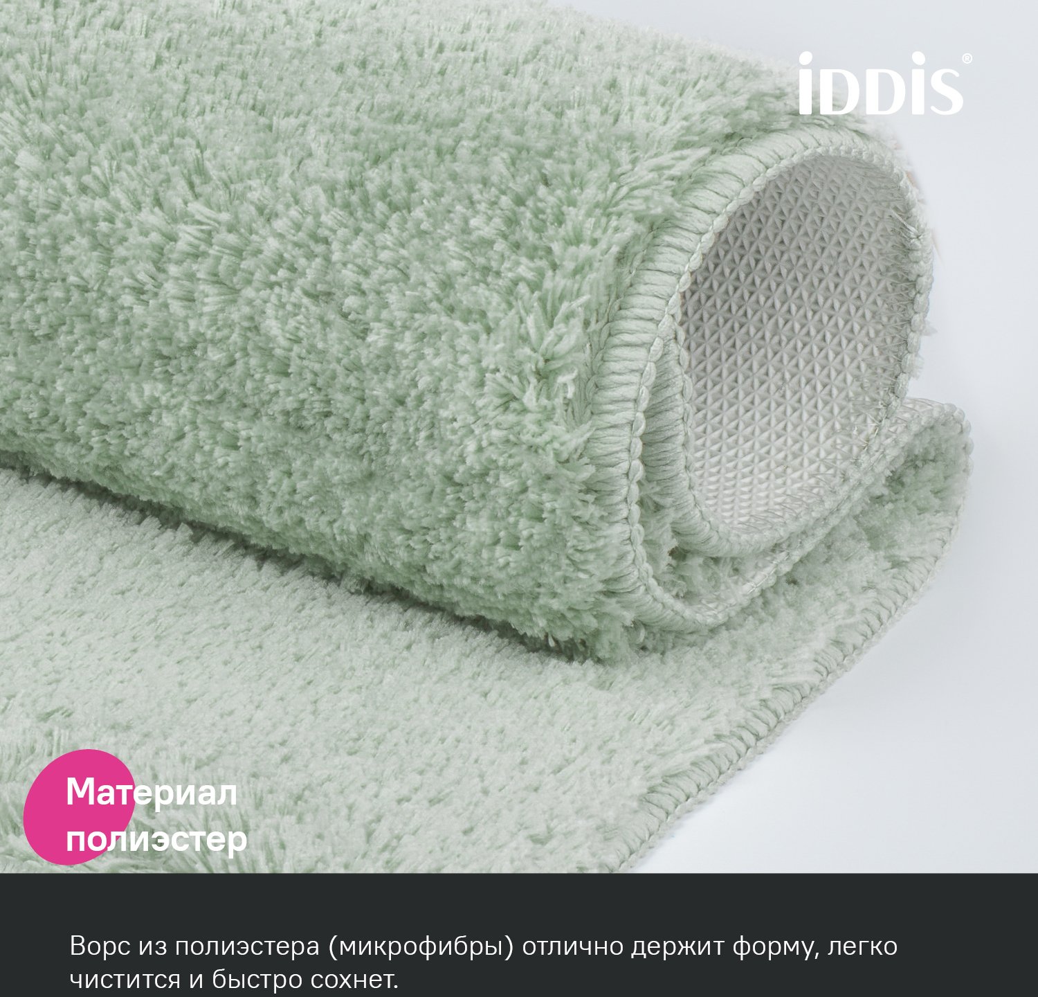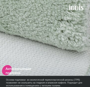 Мягкий коврик для ванной светло-зеленого цвета с плотным высоким ворсом (2 см), очень приятный на ощупь. Стриженый ворс из микрофибры отлично держит форму, легко чистится и быстро сохнет. Коврик подойдет для ванной и туалета. • Этот коврик в ванную противоскользящий: основа из экологичной термопластичной резины (TPR) позволяет не скользить на гладком и влажном кафеле. Подходит для использования в помещениях с теплыми полами. • Благодаря современным влагостойким материалам и качественной обработке краев коврик не потеряет яркости красок, не обветшает и надолго останется привлекательным как в день покупки. • Несложно ухаживать: разрешена деликатная стирка при температуре до 40 градусов с жидким моющим средством; не сушить на батарее, избегать солнечных лучей.