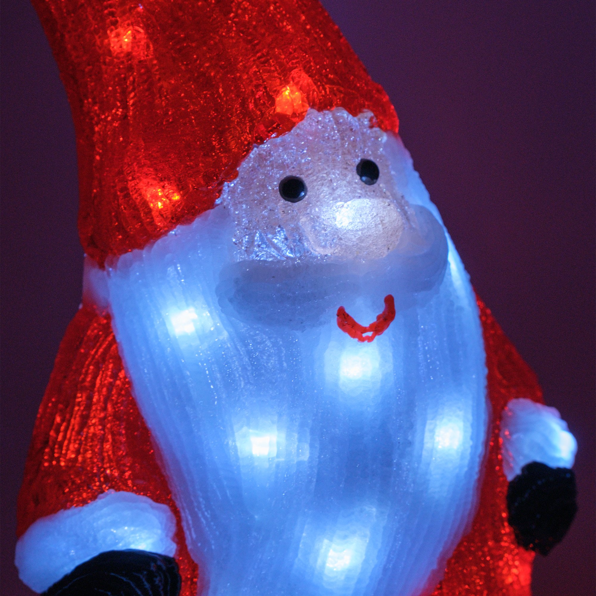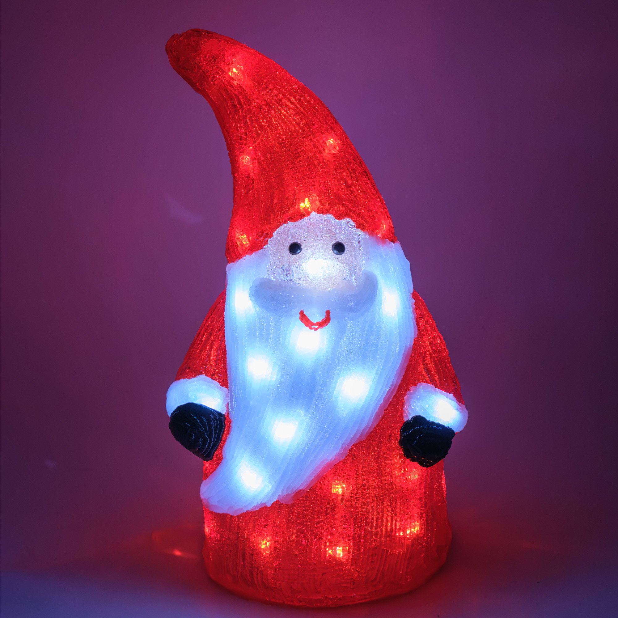 Гном имеет размеры 38 см и состоит из 40 ярких светодиодов, которые обеспечивают равномерное и яркое освещение. Степень защиты IP44 гарантирует надёжную работу даже при попадании брызг воды, что делает эту фигуру идеальной для использования как внутри помещения, так и снаружи. Холодный белый свет придаёт особую магию и уют.