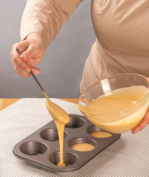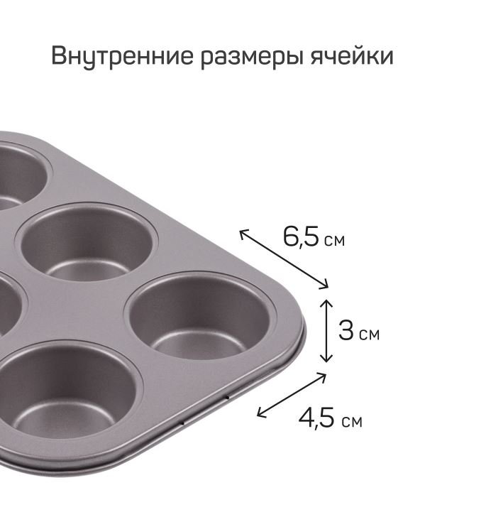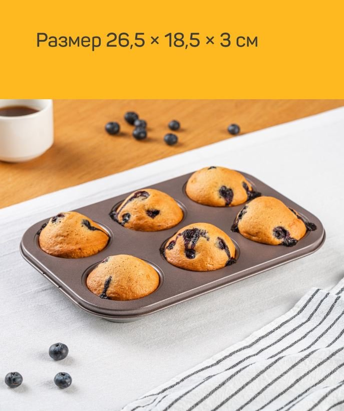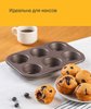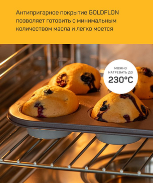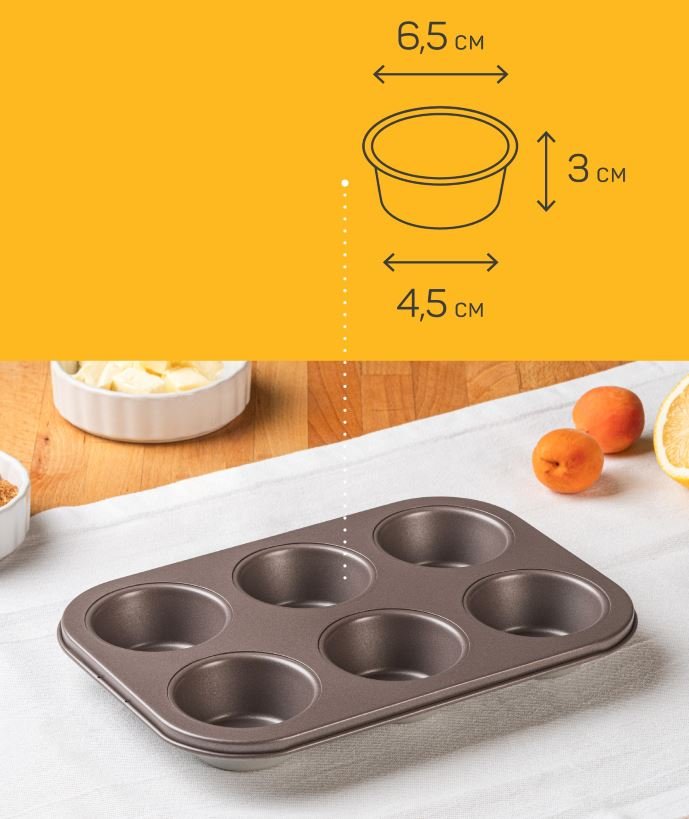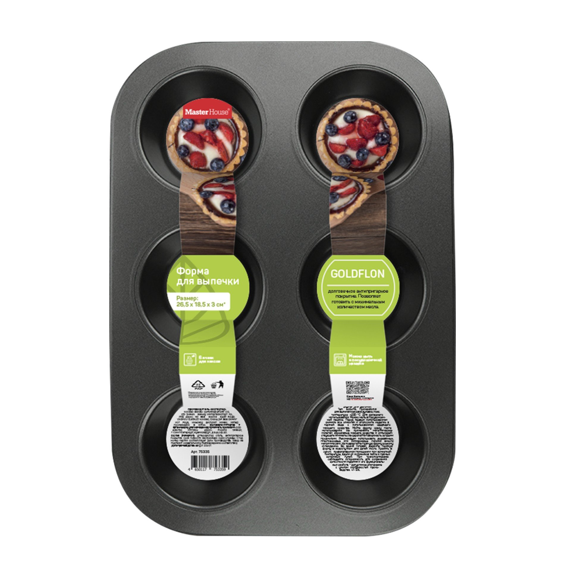 Форма для выпечки кексов, 6 ячеек. Равномерный прогрев изделия. Антипригарное покрытие GOLDFLON. Внешнее и внутреннее антипригарное покрытие для легкого ухода. Толщина металла 0,4 мм. Можно мыть в посудомоечной машине.