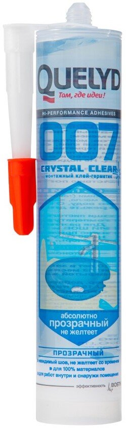 Абсолютно прозрачный! Не желтеет со временем. Quelyd 007 Crystal Clear специально разрабо-тан, как универсальный клей-герметик для за-полнения «заметных» соединительных швов, склеивания свето-прозрачных конструкций. Рекомендован для приклеивания различных строительных материалов из металла, синтетических материалов, стекла, дерева, бетона и т.д. Решает 100% задач по ремонту и отделке: клеит и герметизирует. Клеит даже под водой. Не содержит растворителя: практически без запаха. Для работ внутри и снаружи помещения. Устойчив к воздействию погоды и температур от -45 °С до +120 °С. Не наносить точечно.