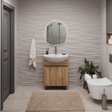 Тумба с раковиной GRACE – это стильный минимализм и уют в вашей ванной комнате. Три размера и благородная палитра – теплый древесный цвет корпуса и фасада – позволят создать уютное и гармоничное пространство даже в небольшой ванной. Эстетика и практичность GRACE подарят вам ощущение спокойствия и комфорта. Преимущества: - Влагостойкие материалы: Фасад из МДФ с матовой ПВХ пленкой и корпус из ЛДСП гарантируют долговечность в условиях повышенной влажности. - Удобное хранение: Полки идеально подойдут для хранения средств гигиены, косметики, полотенец и бытовой химии. - Надежность: Дверки оснащены петлями с доводчиком, что позволяет плавно и бесшумно их закрывать. Надежные металлические навесы выдерживают нагрузку до 100 кг (пара). Раковина и крепления входят в комплект тумбы. GRACE – гармония стиля и функциональности в вашей ванной комнате.