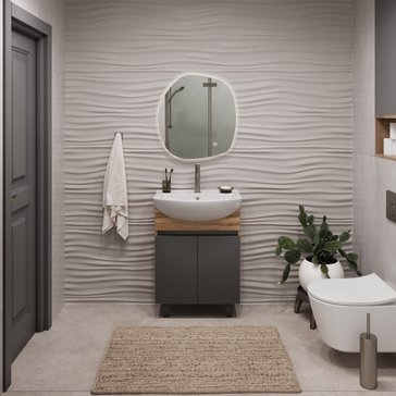 Тумба с раковиной GRACE – это стильный минимализм и уют в вашей ванной комнате. Три размера и благородная палитра – теплый древесный корпус и глубокий темно-серый фасад – позволят создать гармоничное пространство даже в небольшой ванной. Эстетика и практичность GRACE подарят вам ощущение спокойствия и комфорта. Преимущества: - Влагостойкие материалы: Фасад из МДФ с матовой ПВХ пленкой и корпус из ЛДСП гарантируют долговечность в условиях повышенной влажности. - Удобное хранение: Полки идеально подойдут для хранения средств гигиены, косметики, полотенец и бытовой химии. - Надежность: Дверки оснащены петлями с доводчиком, что позволяет плавно и бесшумно их закрывать. Надежные металлические навесы выдерживают нагрузку до 100 кг (пара). Раковина и крепления входят в комплект тумбы. GRACE – гармония стиля и функциональности в вашей ванной комнате.