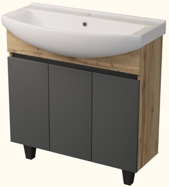 Тумба с раковиной GRACE – это стильный минимализм и уют в вашей ванной комнате. Три размера и благородная палитра – теплый древесный корпус и глубокий темно-серый фасад – позволят создать гармоничное пространство даже в небольшой ванной. Эстетика и практичность GRACE подарят вам ощущение спокойствия и комфорта. Преимущества: - Влагостойкие материалы: Фасад из МДФ с матовой ПВХ пленкой и корпус из ЛДСП гарантируют долговечность в условиях повышенной влажности. - Удобное хранение: Полки идеально подойдут для хранения средств гигиены, косметики, полотенец и бытовой химии. - Надежность: Дверки оснащены петлями с доводчиком, что позволяет плавно и бесшумно их закрывать. Надежные металлические навесы выдерживают нагрузку до 100 кг (пара). Раковина и крепления входят в комплект тумбы. GRACE – гармония стиля и функциональности в вашей ванной комнате.