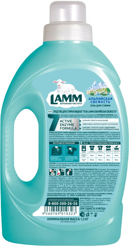 Гель для стирки «LAMM альпийская свежесть » с пониженным пенообразованием с биодобавками эффективно и бережно отстирывает белые и светлые изделия из хлопчатобумажных, льняных и синтетических тканей, а также тканей из смешанных волокон в стиральных машинах любого типа и при ручной стирке.