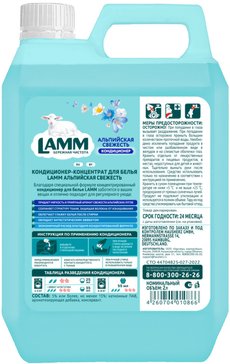 Благодаря специальной формуле кондиционер LAMM придает аромат свежести альпийских лугов, дарит невероятную мягкость, эффект антистатика, сохраняет структуру ткани, экономичный расход.