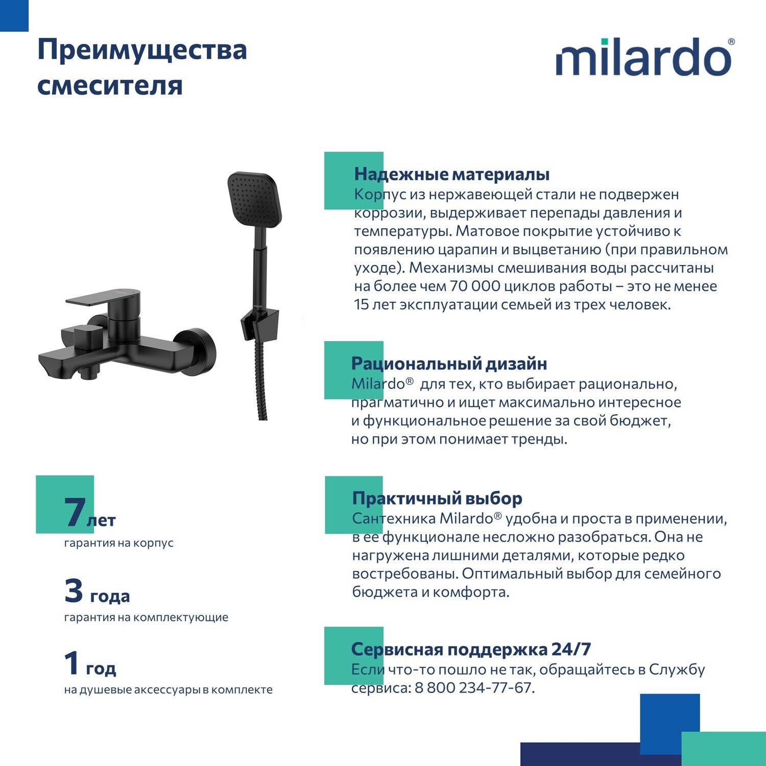 • Гарантия на смеситель Milardo® – 7 лет, на картридж – 3 года, на душевые аксессуары – 1 год.