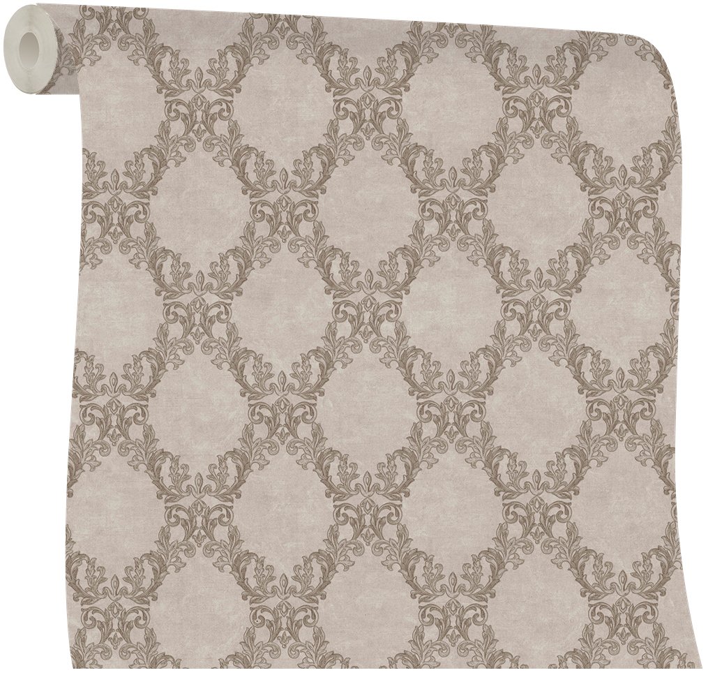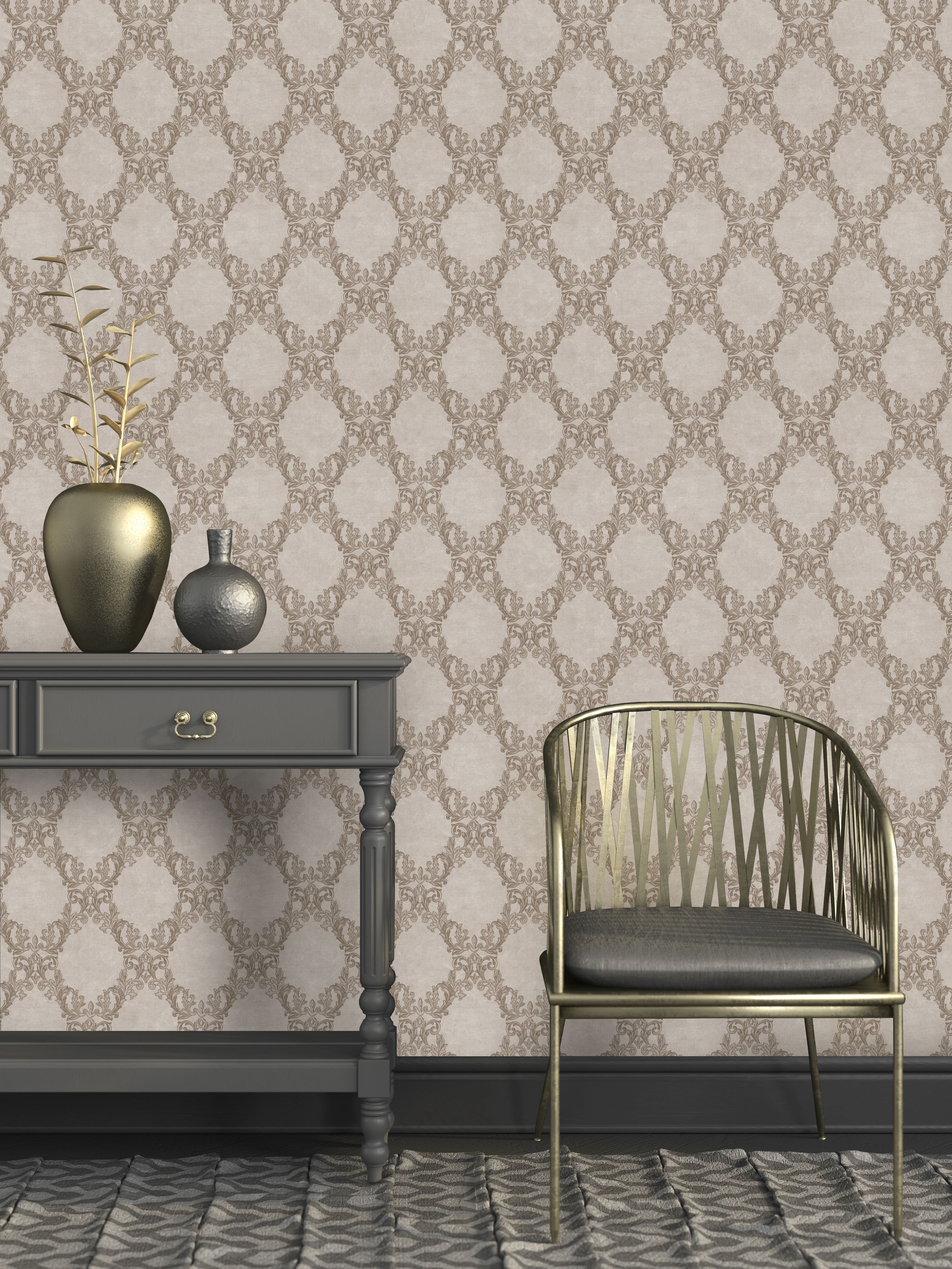 Коллекция обоев «Palazzo» — это воплощение изысканной элегантности и роскоши. Дизайн и название вдохновлены великолепием дворцовых интерьеров, создавая атмосферу аристократизма и утонченного вкуса. На фонах, имитирующих слегка шероховатую фактуру бетона, расположены изящные завитки в стиле барокко — дамаски, украшенные деликатным глиттером и металликом, которые сияют на свету.