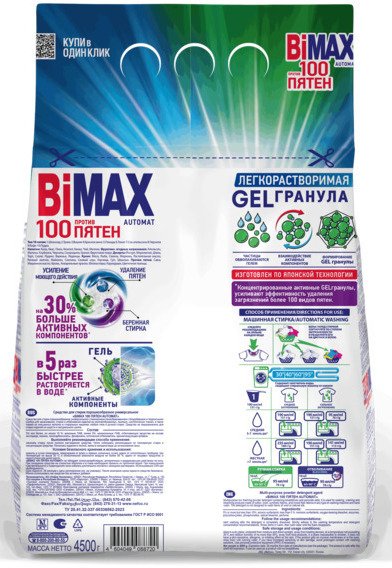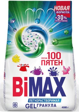 - Порошок стиральный д/машины-автомат BiMax 4,5кг 100 пятен д/цветного белья
