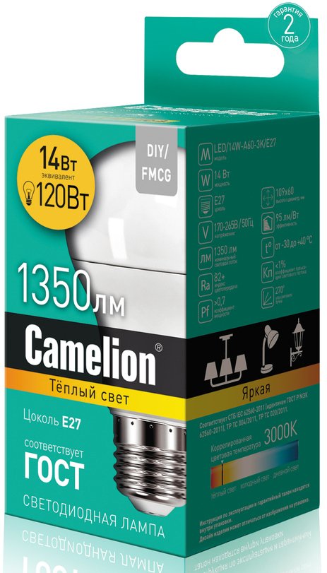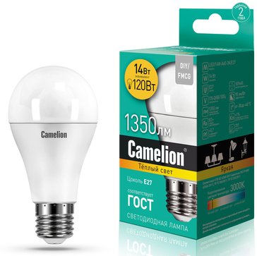 - Лампа светодиодная Camelion LED E27 A60 (груша) 3000K 14Вт 220В теплый свет