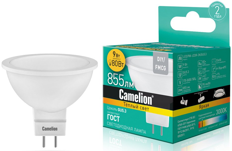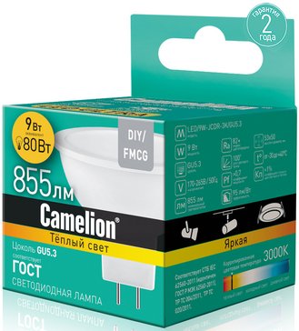 - Лампа светодиодная Camelion LED GU5.3 3000К JCDR 9Вт 220В теплый свет