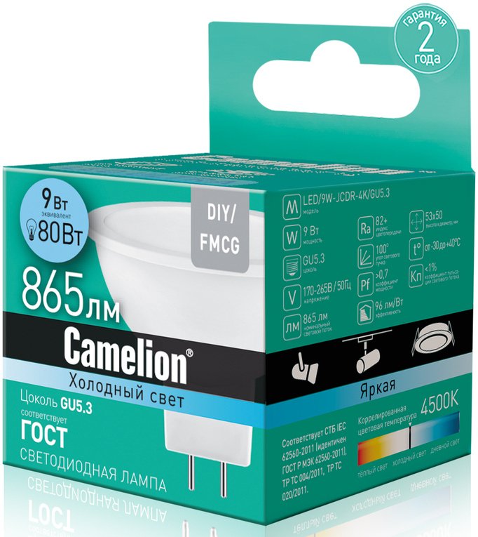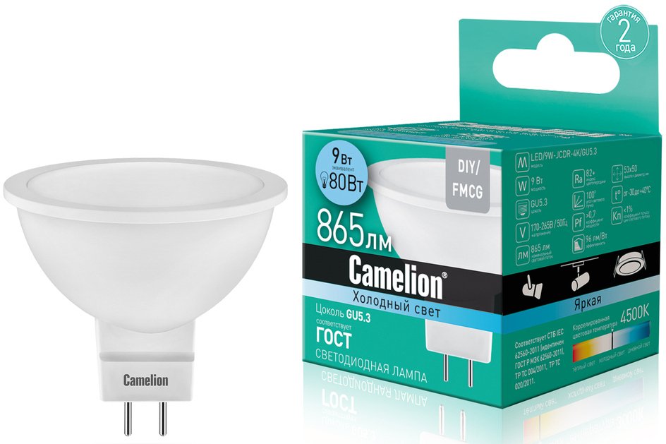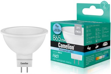- Лампа светодиодная Camelion LED GU5.3 4000К JCDR 9Вт 220В нейтральный белый свет