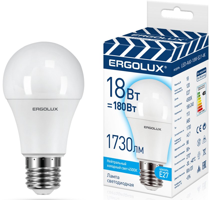 - Лампа светодиодная Ergolux LED E27 A60 (груша) 4500K ЛОН 18Вт 172-265В нейтральный белый свет