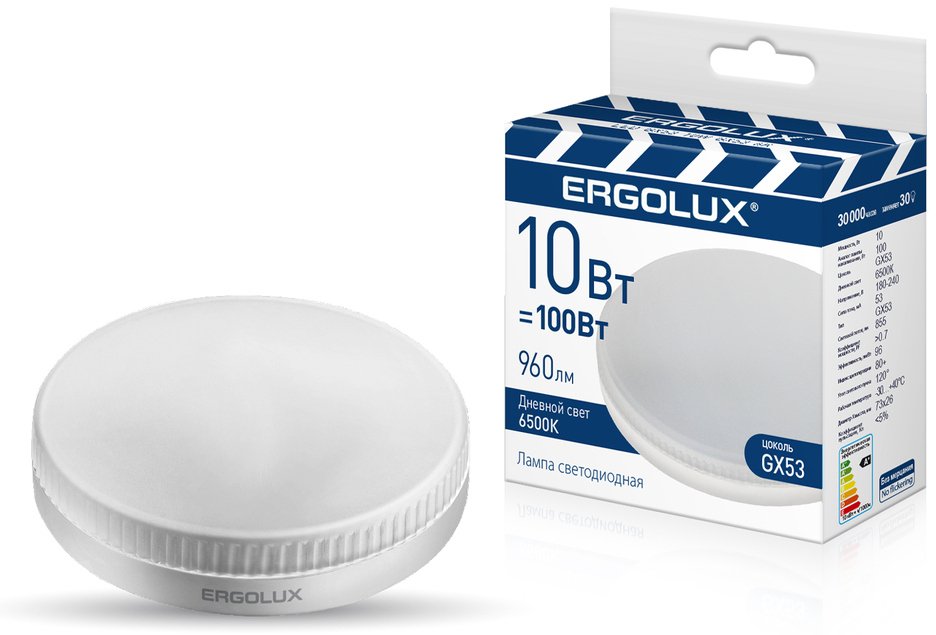 - Лампа светодиодная Ergolux LED GX53 6500К 10Вт 180-240В холодный белый свет