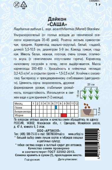 Получите хрустящий урожай уже этим летом! Закажите семена дайкона «Саша» прямо сейчас — и наслаждайтесь свежестью и пользой натуральных овощей. Это не просто корнеплод, а ваш шаг к здоровому питанию и радости от собственного огорода.