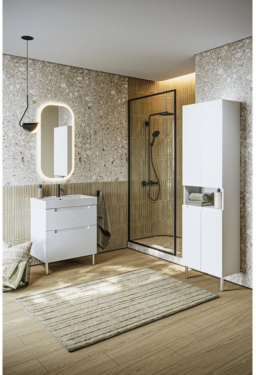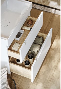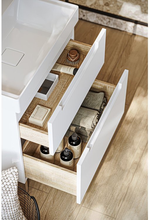 Белоснежные фасады с интегрированной ручкой‑зацепом объединяют эстетику и удобство. Тумбы представлены в двух вариантах: с одним ящиком (для компактных пространств) или с двумя (для большего хранения). Ящики оснащены мягким закрыванием и отделкой под дерево.