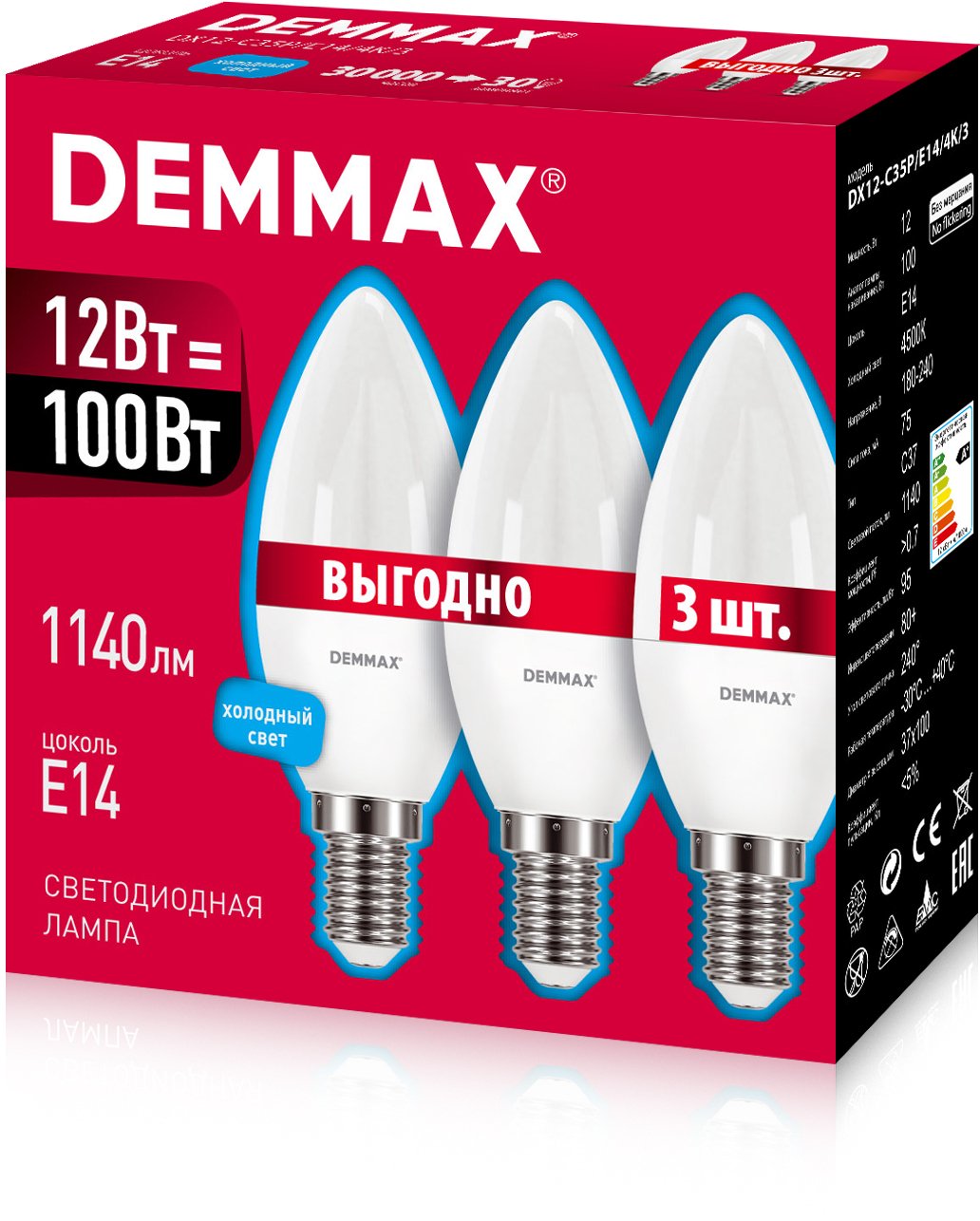 - Лампа светодиодная DEMMAX DX12-C35P ПРОМО ПАК 3 штуки 12Вт Е14 4500К 207-253В